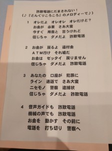 このようなカードが配られました。署長さん自らがマイクを持って皆さんにアピールされていたのですが、よく出来ています。(皆で合唱いたしました)うちの母は、まだ矍鑠としておりますが、少し弱ったら、一緒に唄いたいと思います。